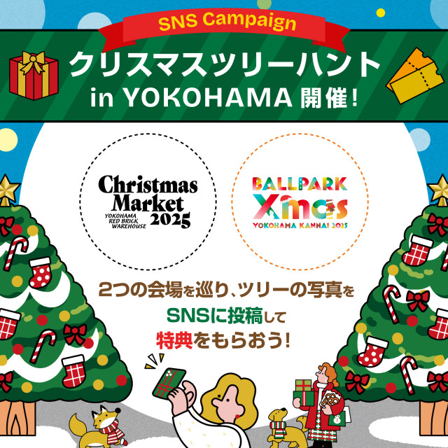 横浜公園を中心に行われる「BALLPARK Xmas YOKOHAMA KANNAI 2025」と横浜赤レンガ倉庫で行われる「Christmas Market in 横浜赤レンガ倉庫」の連携施策として、それぞれの会場のクリスマスツリーを写真に撮ってSNSに投稿すると、もう一方の会場で使える特典をゲットできるSNS投稿企画「クリスマスツリーハント in YOKOHAMA」を実施します。この冬は、横浜の2つのクリスマスイベントを巡って、思い出を作りませんか?