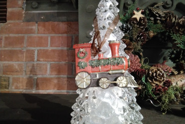 赤い汽車に緑色のリースや植物、金色のタイヤとまさにクリスマスカラーのお飾りになっています。