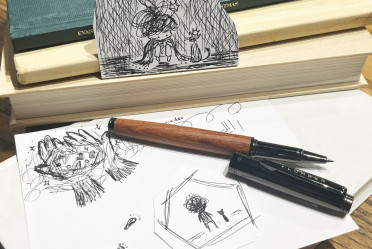 作者がペンを置くと、少年は紙の上をトコトコ歩き、隣に描かれた猫と目が合い通じあいます。二人はページの中で小さな冒険を始めるのです。机の上の本が山になれば、それは彼らにとって大きな城。消しゴムのかけらも、光る宝石に見えてきます。