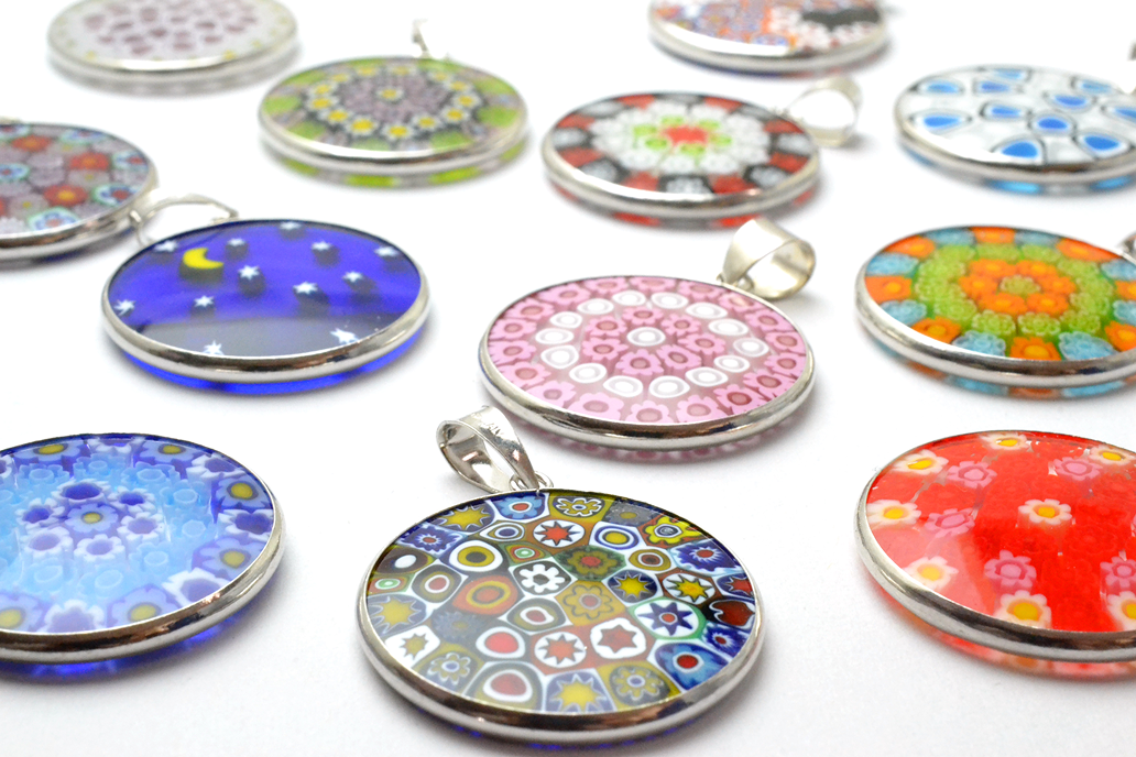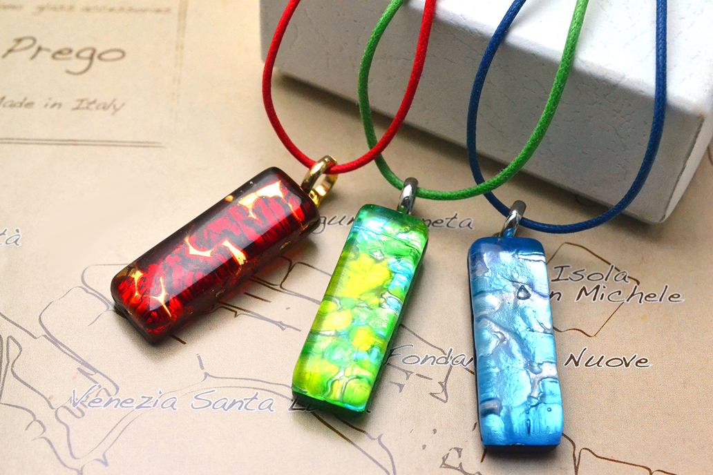 全てイタリアからの直輸入。本場ベネチアの工房で、職人が手作りで仕上げた一点物のベネチアングラスアクセサリーです。カジュアルなタイプから伝統的なものまで、幅広いラインナップとなっています。ペンダントトップには、イタリア製コットンのネックレスをお付けしています。25色のカラーから選べて、金属アレルギーの方にも安心です。