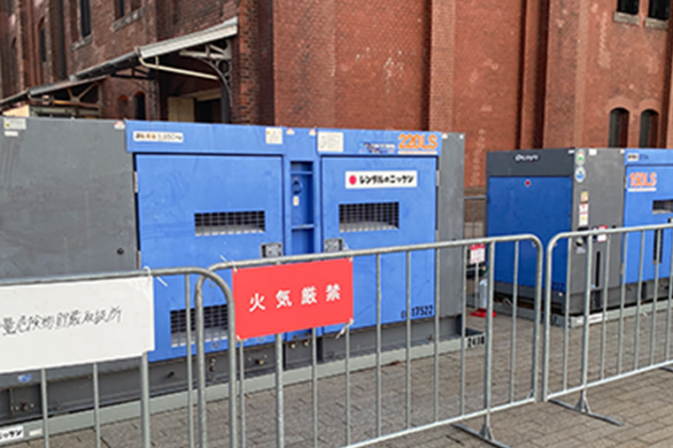 会場内の発電機の燃料は天然ガスから精製されたGTL燃料(軽油代替燃料)で、従来の軽油を使用した場合よりCO2を約8.5%削減できます。